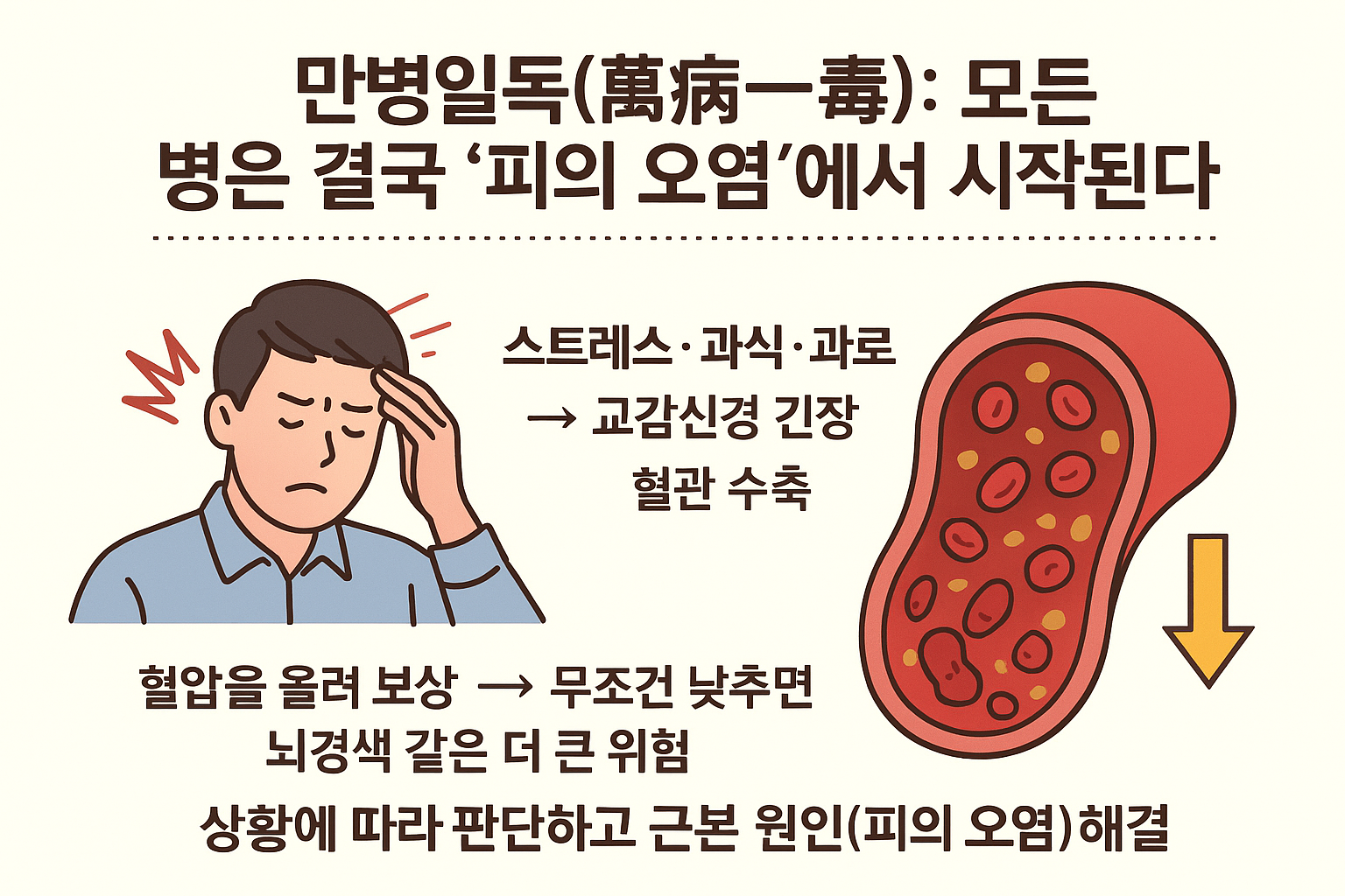 핵심 가설은 간명하다. 스트레스·과식·과로 → 교감신경 긴장 → 혈관 수축. 여기에 과잉 영양분과 대사 노폐물이 더해지면 피가 탁해지고(‘오염’) 혈관벽에 달라붙어 온갖 문제를 부른다. 이때 몸은 좁아진 길로 피를 밀어 넣기 위해 혈압을 올려 보상하는데, 이마저 무작정 낮추면 뇌혈류가 떨어져 더 큰 위험(예: 뇌경색)으로 번질 수 있다는 경고도 덧붙인다. 물론 쇼크 위험이 있으면 대증치료가 필요하다는 단서도 분명히 달아 둔다. 포인트는 “항상”이 아니라 “상황 판단”이다.